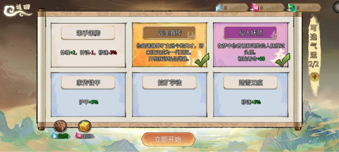 因为可以轮回的缘故,所以新手刚玩的时候最好选择(匠圣真传)让你开局就有一把不错的武器