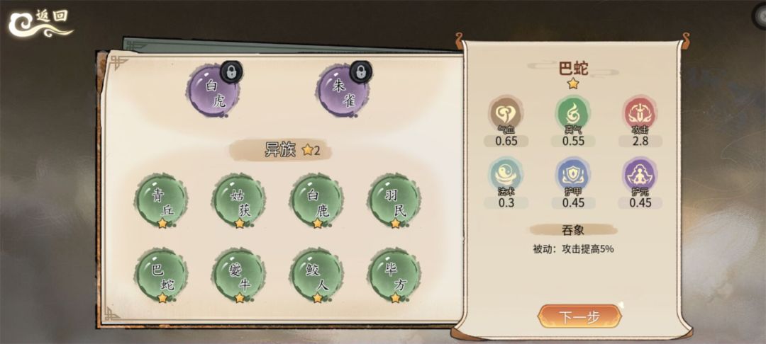 这里我们新手优先选择巴蛇 因为被动增加5%的攻击