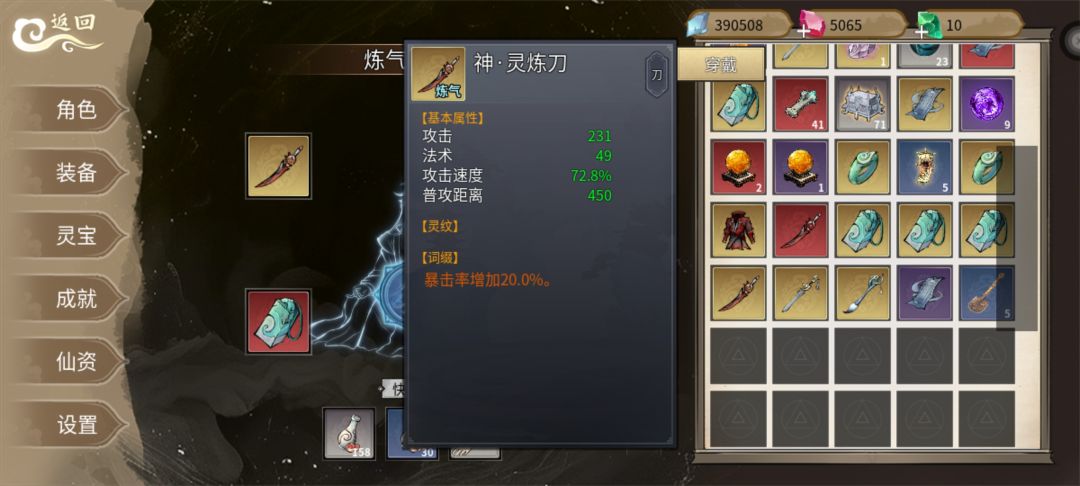 演道每点增加一点仙灵 每 5 10 15 20会增加仙灵 仙灵相对于一个包裹如图上面的10纳气就需要有5仙灵才能激活装备附加的效果