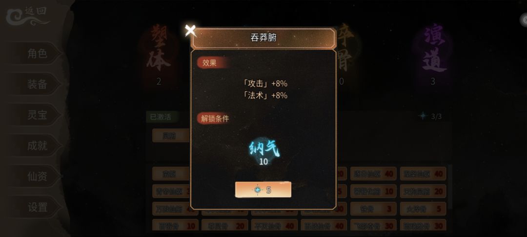 仙资分别为塑体 纳气 淬骨 演道 每 5 10 20 30 50会增加一个效果