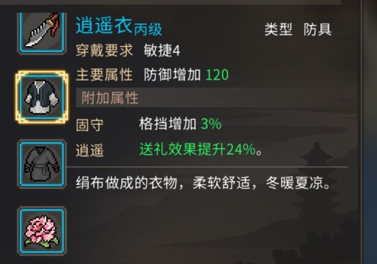 二、想要游玩过程更“丝滑”,来到任何一个大城市,第一件事,存档,说不定就会遇到什么奇奇怪怪的事情;第二件事,买衣服。都来大城市了,肯定要换件新衣服庆祝庆祝,去当地的衣服店买逍遥衣,存档加回档刷衣服属性(送礼效果提高25%最佳),这衣服拿到能省不少送礼钱
