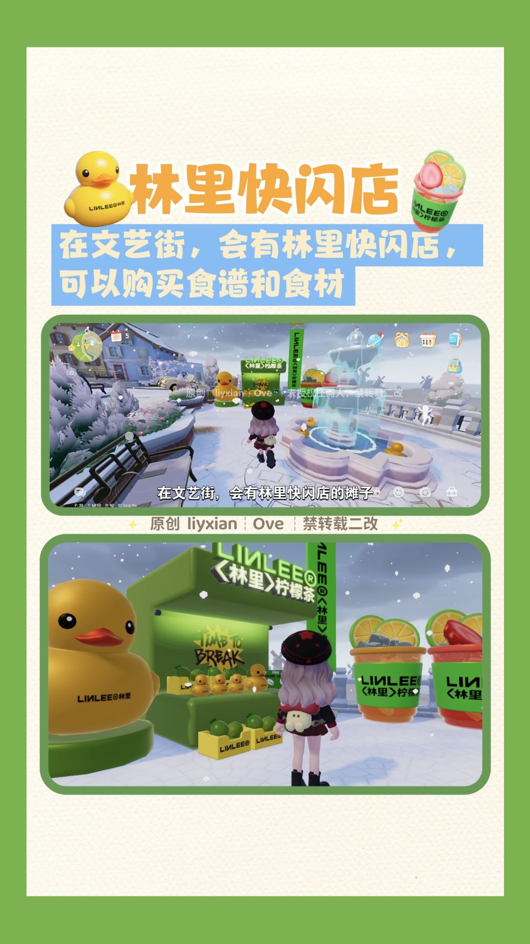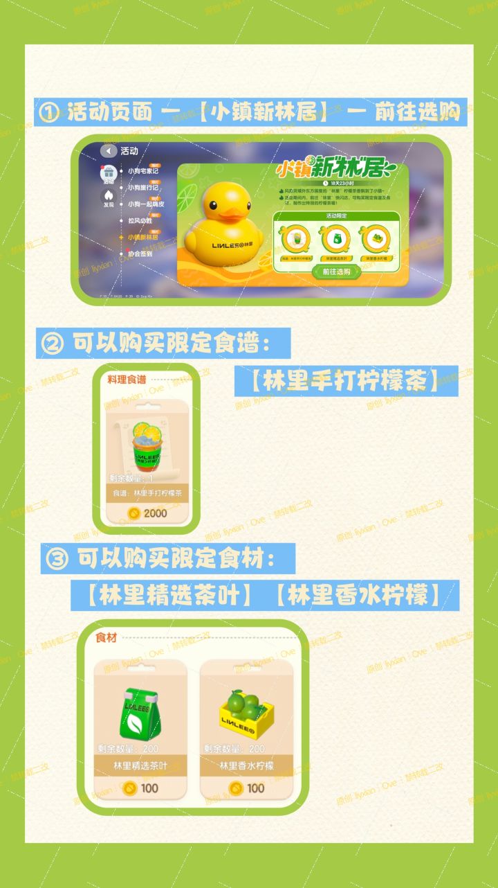 活动期间,前往【林里快闪店】,可以购买限定食谱【林里手打柠檬茶】,和限定食材【林里精选茶叶】以及【林里香水柠檬】。