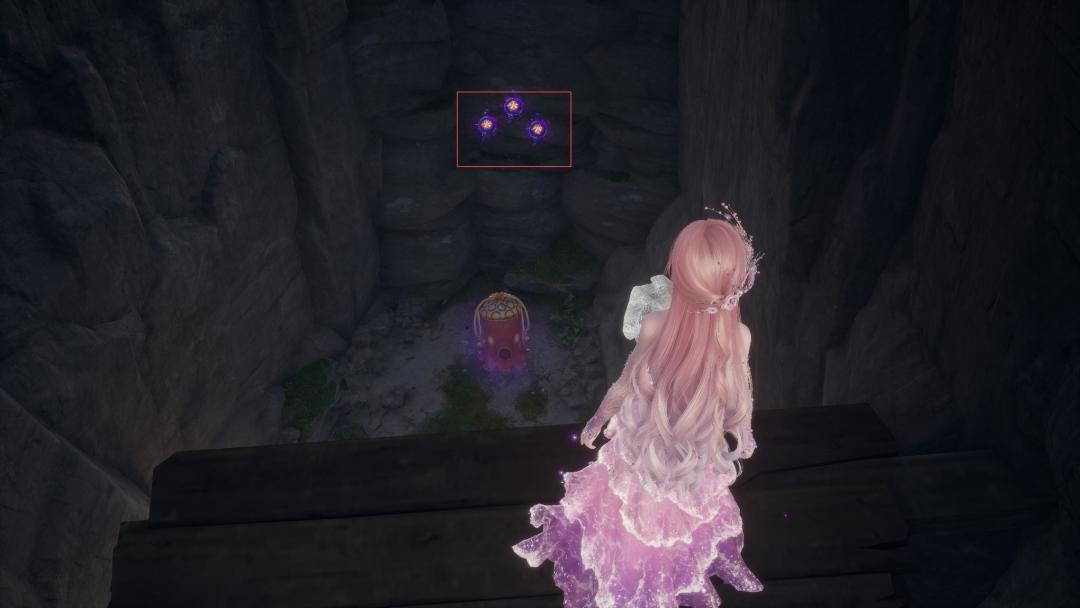 使用滑翔套装,到达此位置,有两颗灵感露珠。继续向下跳。