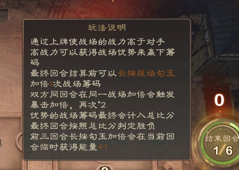 【对局规则】:6个回合,每回合依次给1/2/3/4/5/6点能量,武将卡牌左上角为出场所需能量值,右上角为分,个别时候会受对手和战场影响有所波动。中间区域的战场每回合揭露一个,三个回合揭露全部。