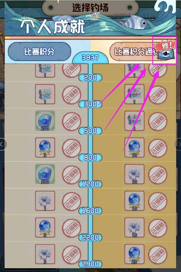 领取方式:探险-码头-钓鱼-比赛钓场左侧【图标】-通行证页面右上角,如下图所示:
