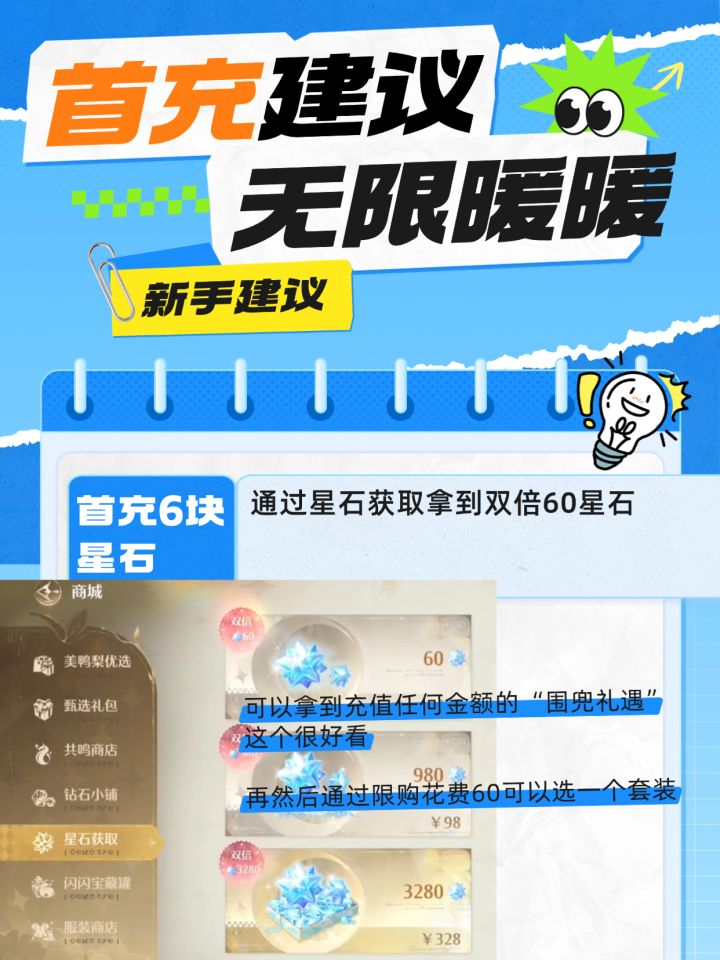 《无限暖暖》的资源很多,我建议买星石,首次是60个