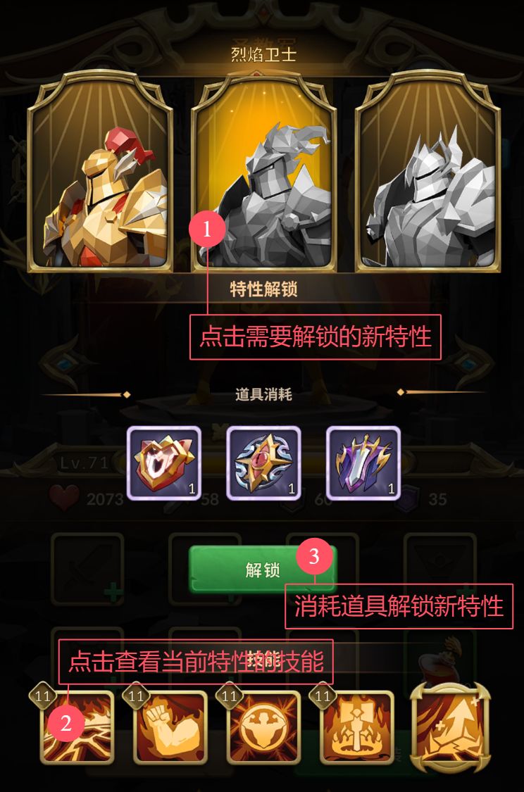4.进入圣教军的英雄界面,选择需要解锁的特性,然后点击解锁,即可获得该特性的圣教军。