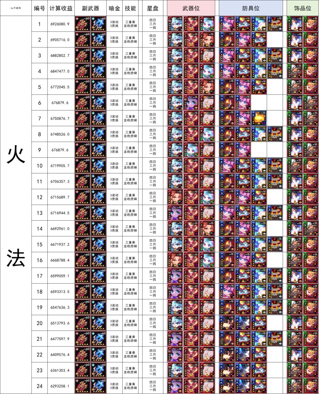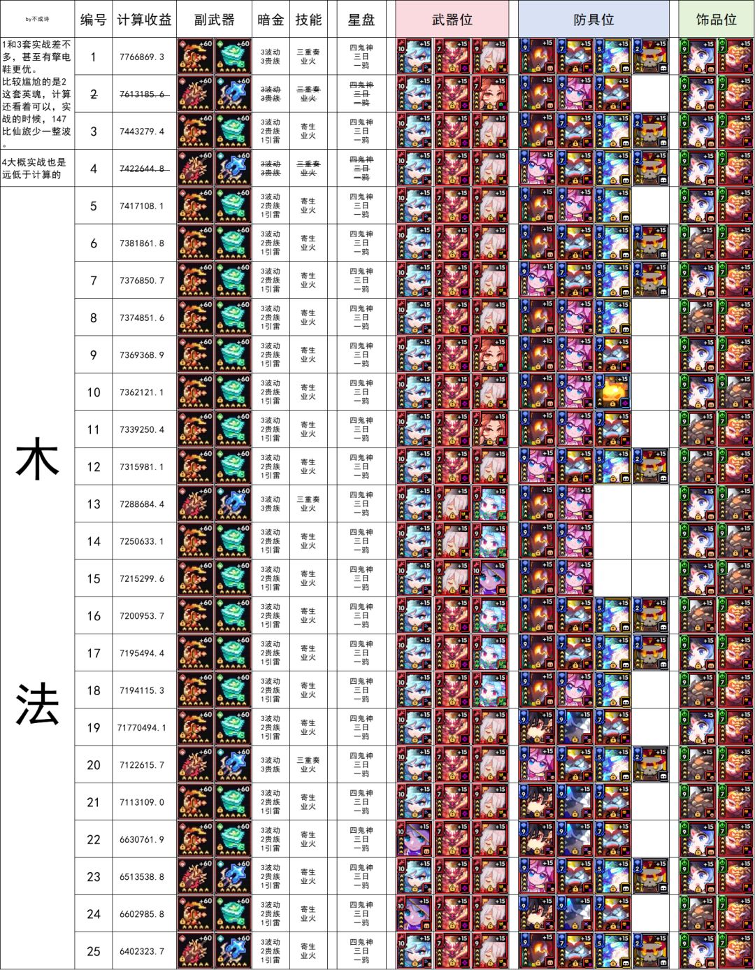 接下来,是各个场景的一些搭配收益排行表格,方便大家参考和选择