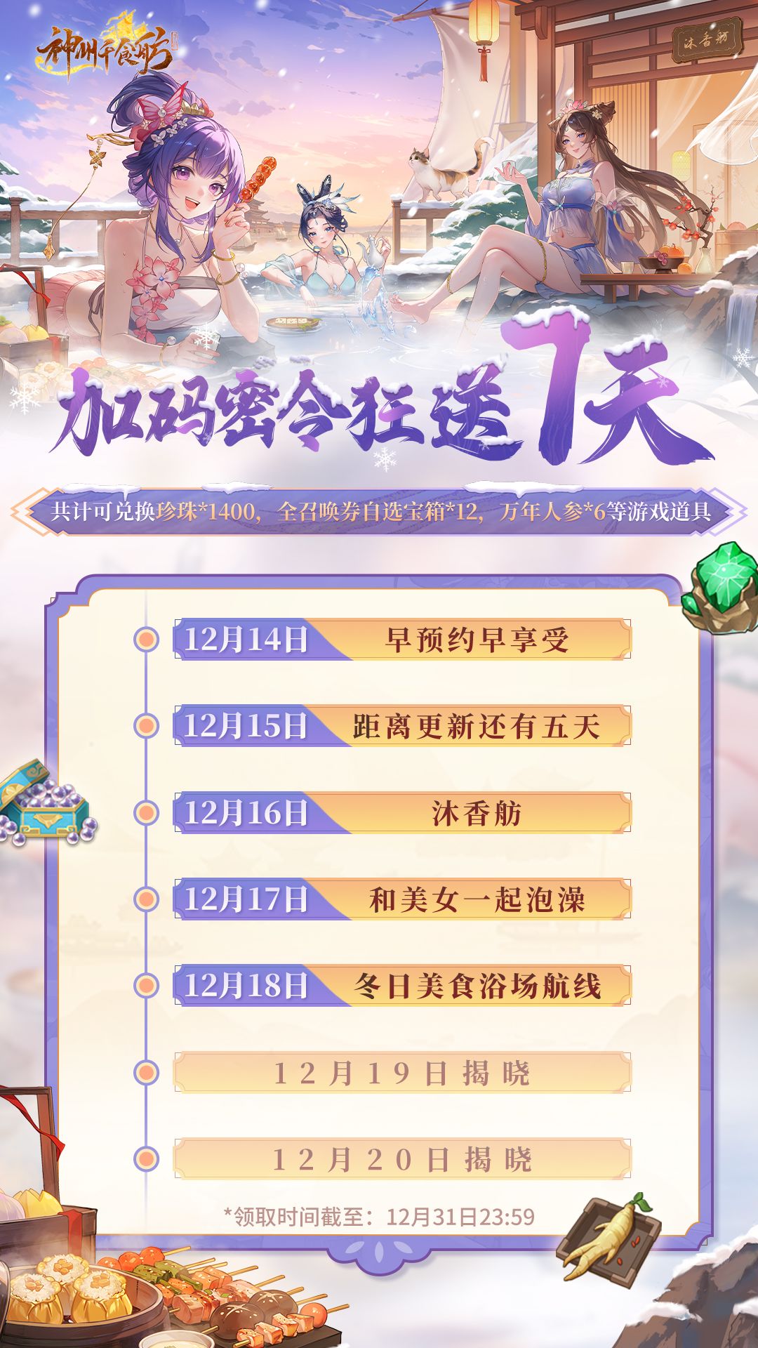 上船泡汤,烦恼跑光!S7赛季&1周年第一波预热将于12月20日正式开启,快来提前感受下“冬日美食浴场”这条新航线的乐趣吧!(文末有密令福利~)