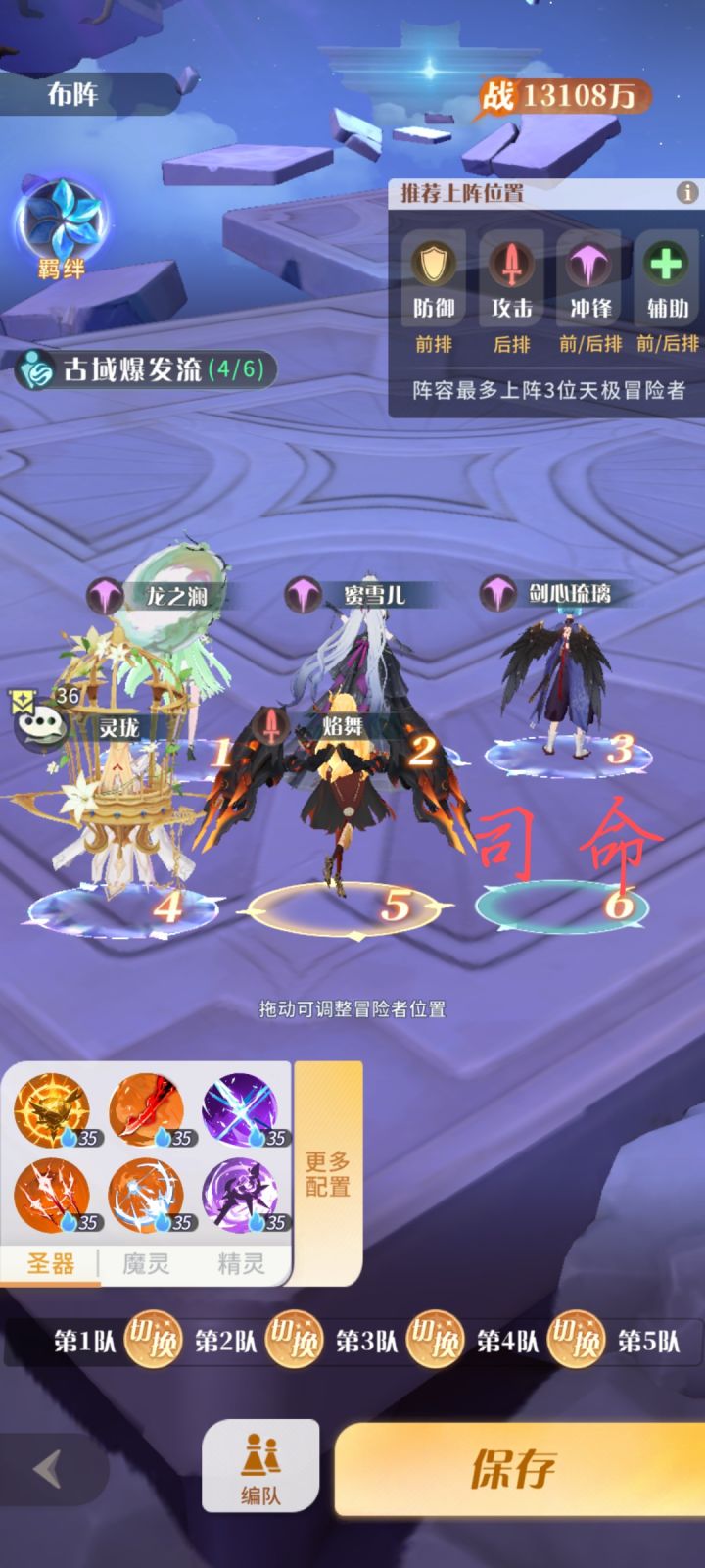这套阵容由剑心,龙澜,灵珑,以及后续的司命,密雪儿,焰舞组成的队伍,整套阵容由剑心主c焰舞副c来整体培养由焰舞的减回血来克制回血的阵容剑心担任爆发输出