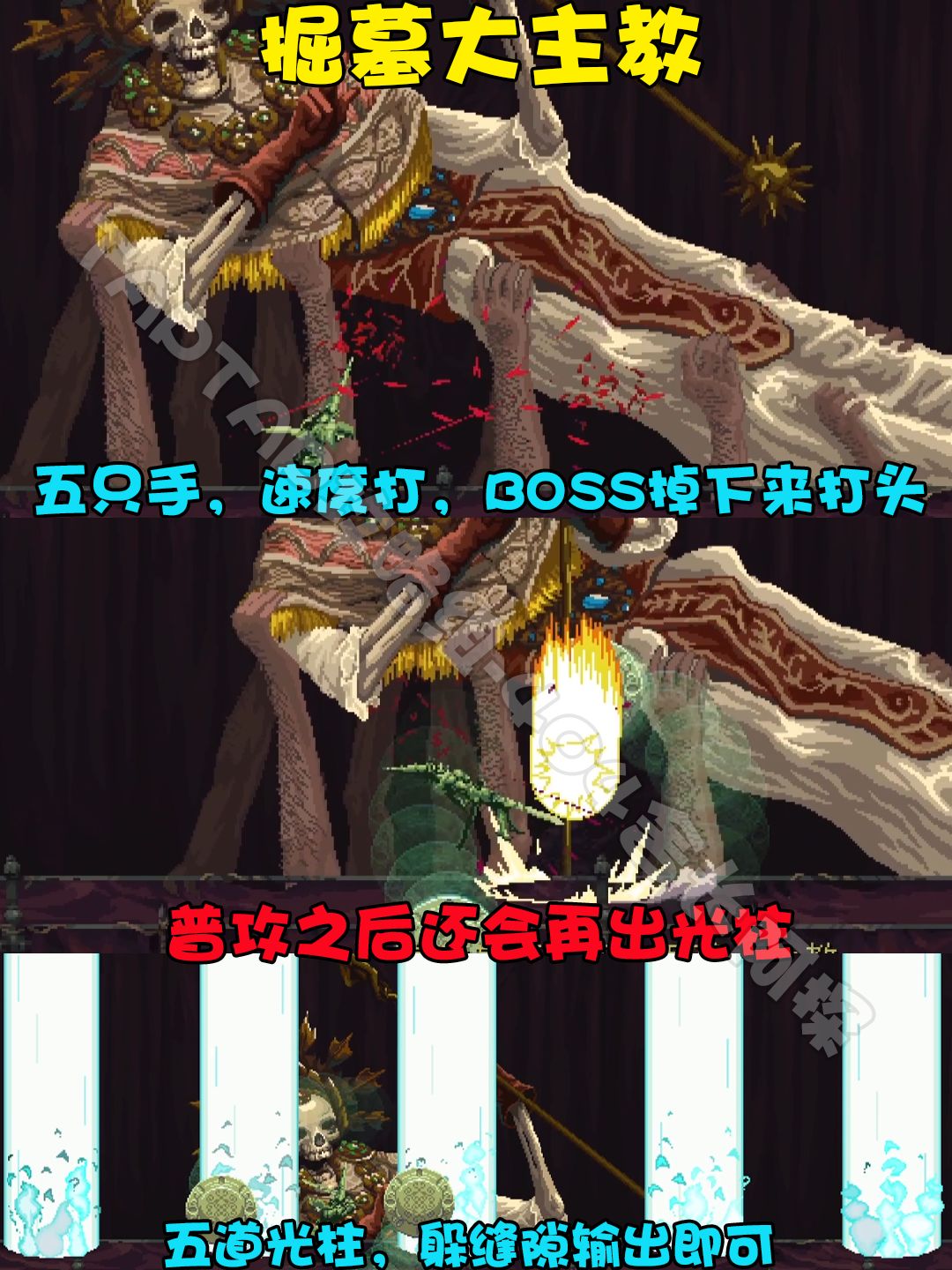 【掘墓大主教】这个BOSS前期非常简单,就是有5只手举着他,快速打掉手就可以了。然后他掉下来打头。1.如果打手打的比较慢,他就会拿锤打你一下,然后地上还会出一道光柱2.召唤五道光柱,躲在中间即可。3.随机出现几道光柱,同样躲在没光柱虚影的地方即可。4.会召唤那些手来拍你。