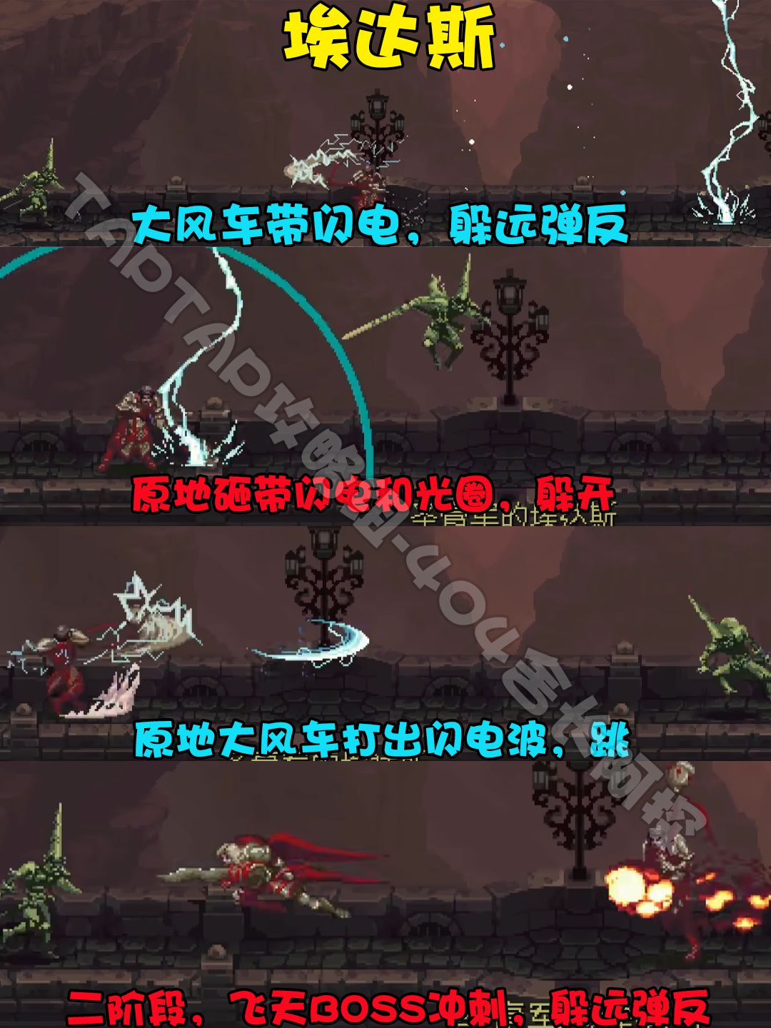 【埃达斯】大风车,旋转战斧移动,移动的过程中,释放闪电。一般释放这个技能都是从一边转到另一边,你需要在最远处,通过弹反来格挡伤害。2.原地砸一下,出一道闪电,一个光圈,躲开即可。3.原地大风车,然后放出闪电波,跳跃躲避即可。4最后剩20%血量的时候进入2阶段,会召唤另一个飞天BOSS。这个飞天BOSS的技能就是冲刺。格挡反击即可。5.进入2阶段之后此时埃达斯平时释放的那个普通攻击会带有数道闪电。