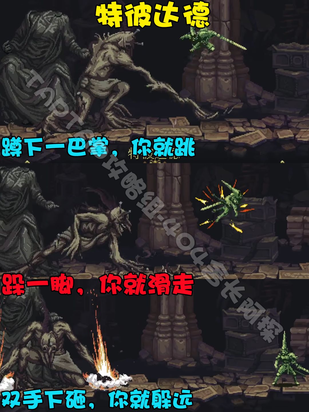 【特彼达德】这个BOSS比较简单。技能有3种,1.蹲下一巴掌,跳起来即可。2.跺一脚,跳起来即可,有时候会从地上钻出两个藤蔓,3.举双手下砸,从身边钻出一堆藤蔓,远离即可。