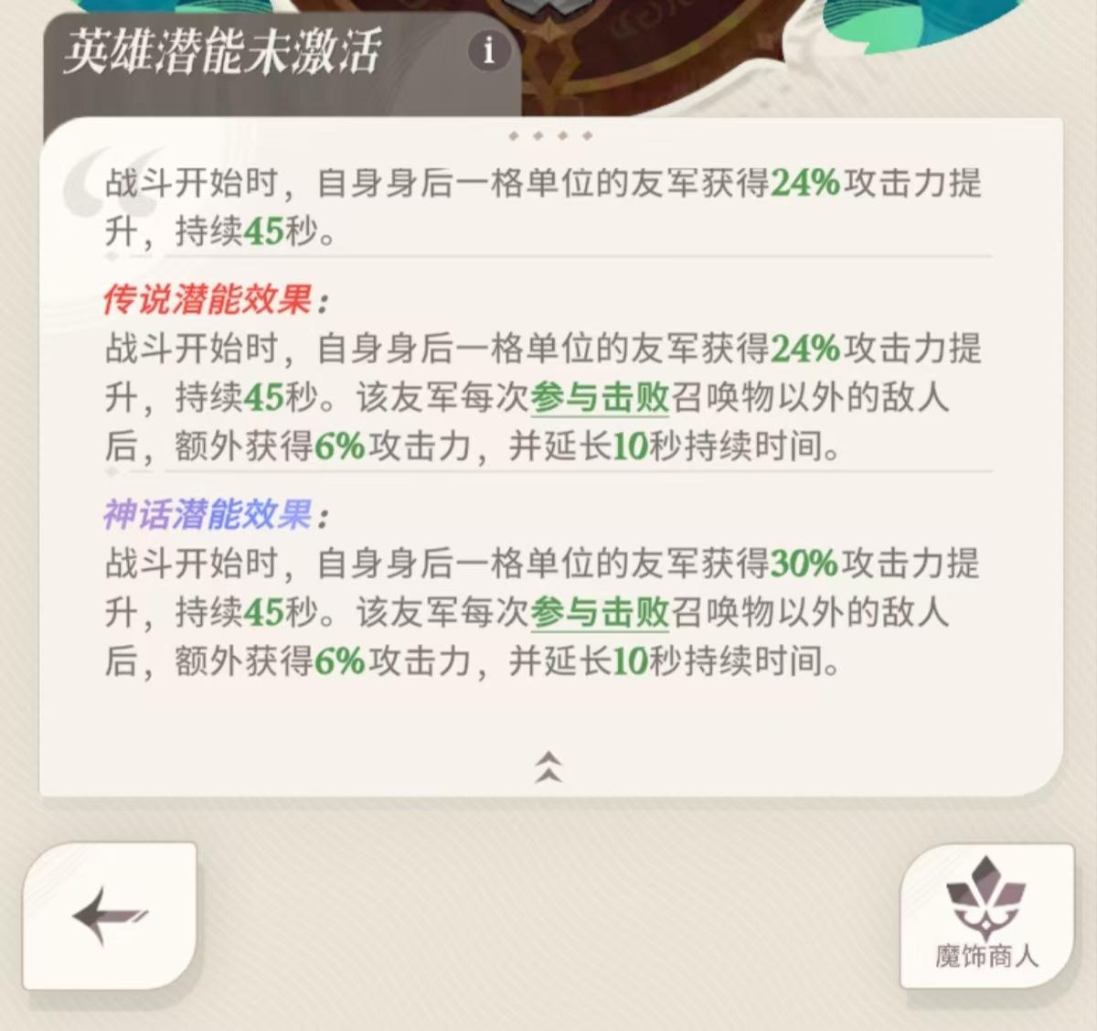 技能分析呼金的技能亮点为大招提供的单体80急速和《呼金百分比攻击力》,所以呼金本身的练度非常重要。而且呼金的开局装置的增益只生效于这一个格子,从格子离开之后呼金的增益就会消失,目前c位中只有迷梦阿德会一直在一个格子不动,所以是相当鸡肋的效果,给队友护盾并且给免控效果看上去是个pvp技能,结合其20格超远距离的射程,可以在巅峰竞尝试就业。但是具体需要正式服上线后再测试。