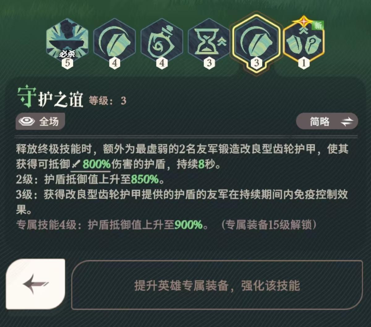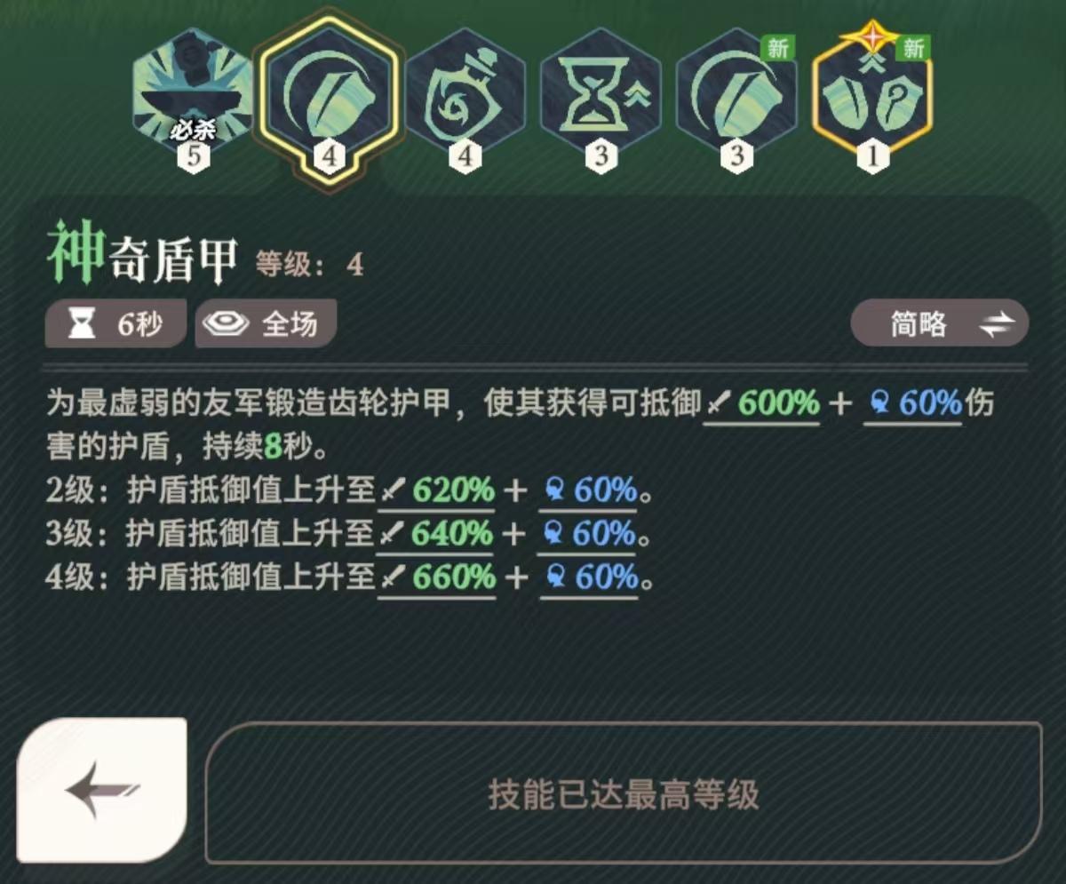 释放终极技能时,额外为最虚弱的2名友军锻造改良型齿轮护甲,使其获得可抵御伤害的护盾,持续8秒。获得改良型齿轮护甲提供的护盾的友军在持续期间内免疫控制效果。