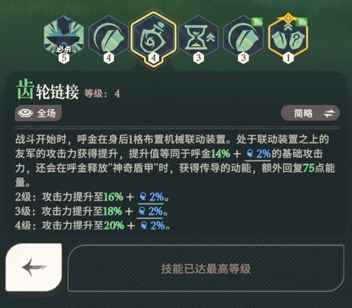 战斗开始时,呼金在身后1格布置机械联动装置。处于联动装置之上的友军的攻击力获得提升,提升值等同于呼金14%的基础攻击力,还会在呼金释放“神奇盾甲”时,获得传导的动能,额外回复75点能重。