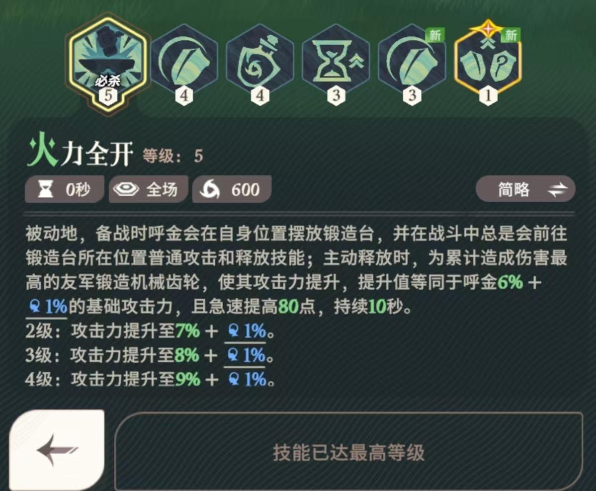 被动地,备战时呼金会在自身位置摆放锻造台,并在战斗中总是会前往锻造台所在位置普通攻击和释放技能;主动释放时,为累计造成伤害最高的友军锻造机械齿轮,使其攻击力提升,提升值等同于呼金的基础攻击力,且急速提高80点,持续10秒。