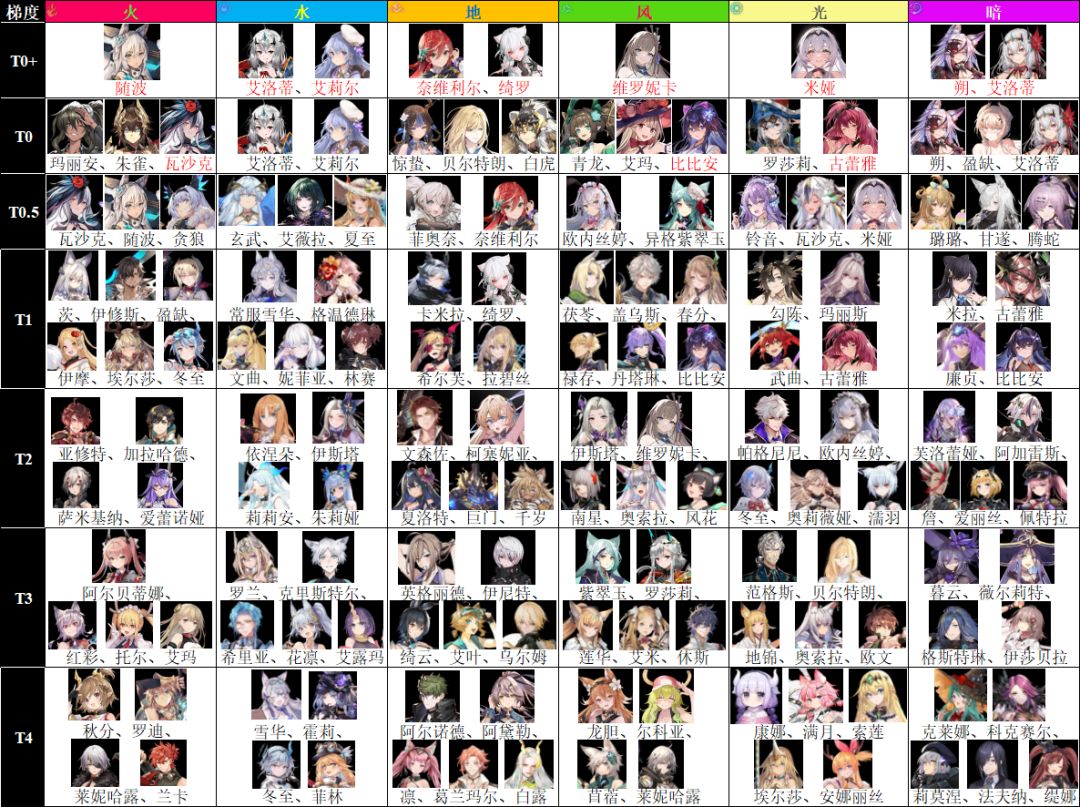4、T0与T0+代表本属两队之一的核心角色,如果都没有则不推荐以该属性作为主要培养对象,T0+特指由于同调加护提升特别大以至于超过T0角色的情况;T0.5可以作为该属性两队之一的前排上场,仅在强度上略逊于T0角色;T1大部份情况下可以作为该属性两队之一的前排上场,在角色配置齐全的情况下需要根据环境和配置来考虑选择哪一个上场;T2泛用性一般,在特定场合下或角色配置不齐全时可以作为某些角色的下位替代;T3较弱,一般不会上场,只有在box不齐全的作为特定场合的对策解的时候才会偶尔有登场的可能;T4目前找不到上场的理由,可以当作不存在。