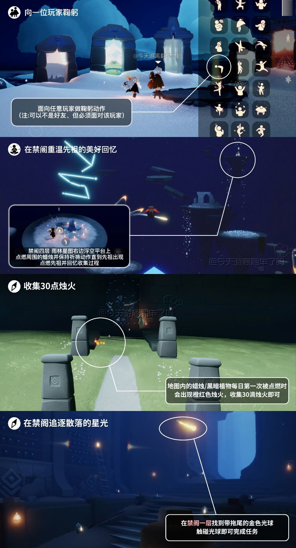 《光遇》游戏中每天的每日任务及大蜡烛的位置都不相同,玩家完成每日任务及收集大蜡烛都可以得到丰厚的兑换奖励,奖励可以用于兑换各种动作及道具,不过很多小伙伴不知道每日任务怎么做,又懒得自己去找大蜡烛的位置,我们汇总了每日任务的完成攻略以及蜡烛位置,一起来看看吧!