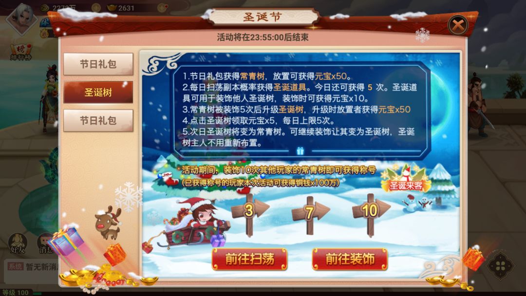 2、活动期间扫荡副本有概率获得随机圣诞道具,圣诞道具可以用来装饰常青树.
