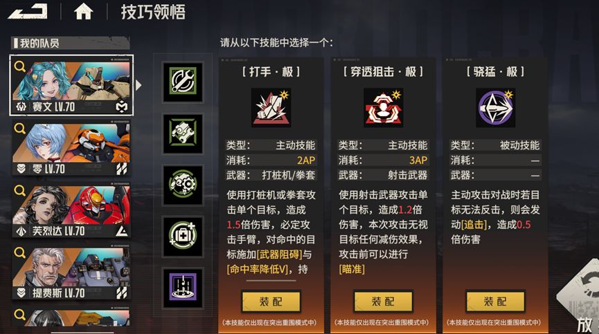 游戏开始之前,需要先构建出自己的初始队伍,从系统提供的三个不同机师中选择一个自己想要的机师,并为其装配上一个额外的技能,即可加入小队,需要注意的是每个机师的机兵和武器都是预设好不可更改的,我们需要改动的只有他们的技能。 下面以下方三个机师为例进行说明