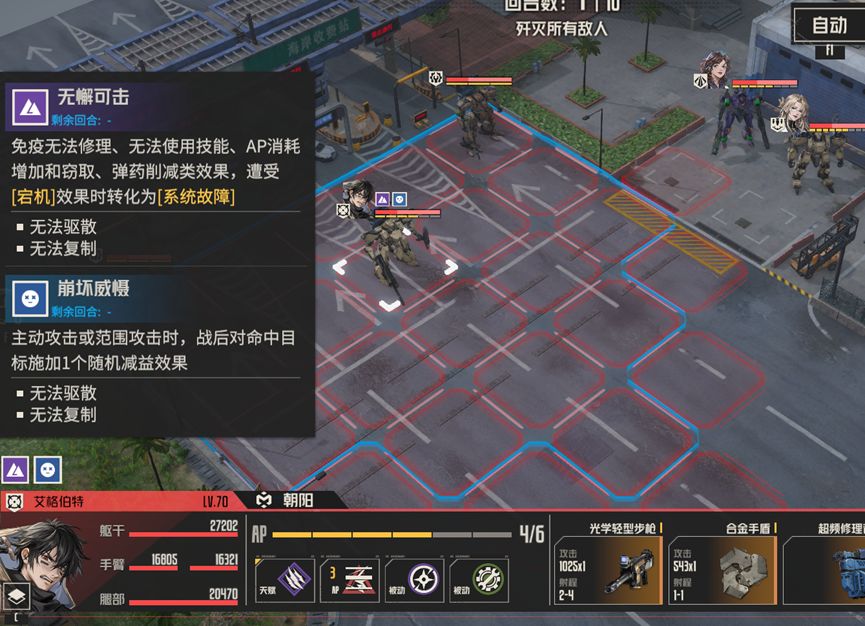 突出重围的战斗是一条龙进行到底的,战斗撤退或者重开,都会被判定失败,需要重新编队重头再来,所以一旦我们点击开始战斗,就只有过关或者失败,没有缓和的余地。关卡有遭遇战,致命强敌,紧急作战三种类型。每种关卡难度和通关条件都不同,这些关卡中,boss基本是固定的,但是精英敌人(机师)是随机的。