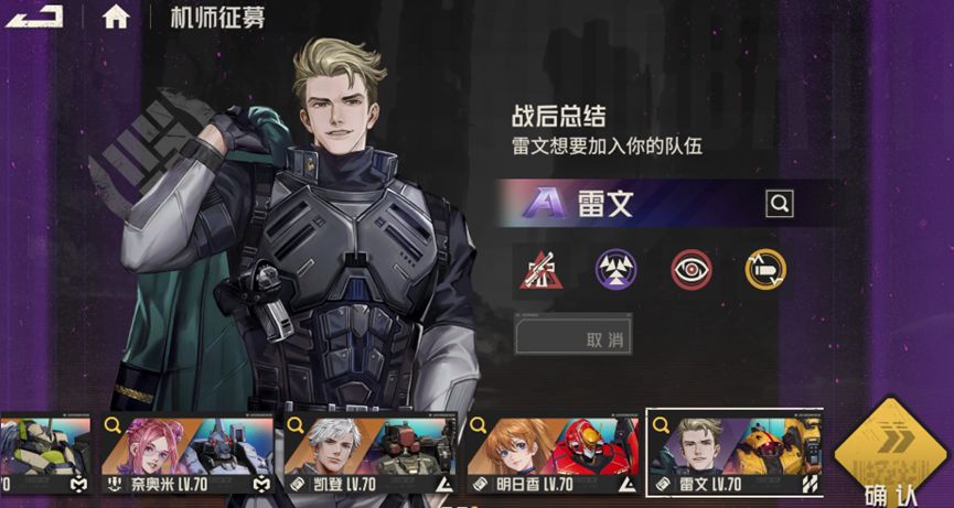 机师征募中我们可以选择是否招募在关卡中被我们击败的精英机师,我们同样可以在招募之前查看他的技能和机兵配置,再决定是否招募,当然笔者在这里建议先招了再说,有好的再换
