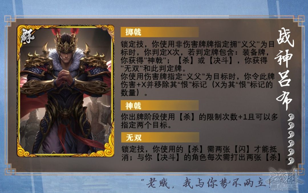 【逢主】你拜一名其他男性角色为“义父”:实际结算为令一名男性角色获得“义父”标记;若两个农民均为未获得过标记的男性,则可以自选其一令其获得标记;若场上此时仅剩一名未获得过标记的男性角色,则强制令其获得标记;不可再次选择拥有“义父”标记的角色为此技能目标;摸等同于其体力值张牌:与其当下血量有关,非体力上限;虽然【逢主】与地主【跋扈】时机相同且均为锁定技,但实际结算中强制优先结算跋扈的准备阶段摸牌,再触发逢主。(由于斗地主无法自定义房间测试武将,本段落的结算为猜测,请以实际结算为准。)界左慈、赵襄这种局内能够改变性别的角色,推测其性别变更为男性的回合,若其没有义父标记,则战吕布能够在下一个回合开始时为其添加印记。界左慈反复变更性别时,义父标记是否消失存疑。【郁郁】你令一名“义父”获得一枚“恨”标记:不能选择没有“义父”标记的角色获得恨;若有两个角色拥有“义父”标记,则可以自选其一使其获得一个“恨”;你于其回合每受到1点伤害或每失去一张牌后,其获得一枚“恨”标记:其指的是拥有“义父”标记的角色,战吕布在拥有标记的角色回合内受伤或失去牌均可触发此技能;失去牌的渠道包括被战吕布自身使用或打出,弃置、被获得、交给、移出游戏外(破军)等,同诸葛瑾明哲;“恨”标记无上限;【掷戟】你使用非伤害牌指定“义父”为目标时:即使用非伤害类锦囊牌,如拆顺等;兵粮寸断和乐不思蜀不触发此技能;时机为战吕布使用该牌、询问场上角色无懈可击之前,故无法通过使用无懈可击让战吕布不触发掷戟;如果同时指定多个角色,只要其中包含了“义父”即进行判定,不需要被指定的目标皆为“义父”;你判定X次:若同时指定了多个角色,则判定所有拥有“恨”标记角色的标记总数次;你获得【神戟】/【无双】:获得对应技能为永久获得,不会随着“义父”或“恨”标记清空而失去,且对两个农民均有效;你使用伤害牌指定“义父”为目标时:即使用伤害类锦囊牌和杀;你令此牌伤害+X并移除其“恨”标记:此牌增加的伤害对全体角色生效,包括没有“义父”标记的角色和战吕布自身;若战吕布同时指定多个角色,则此牌增加的伤害量等同于两个角色“恨”标记的总和;即便此牌未造成伤害,也会移除被指定目标的全部“恨”标记;获得神戟后,出杀时就可直接选择多个目标,而非选定一个目标后询问是否发动神戟进行多指;【戒酒】你的【酒】仅能当其他基本牌使用:可以用【酒】当闪、杀、雷杀、火杀、桃使用;战吕布仍可以通过其他方法使用【酒】,如界简雍巧说(额外成为酒的目标)、何太后鸩毒(使用虚拟酒)等;其他角色可以正常使用战吕布手中的【酒】,如族钟琰观骨;战吕布自身的【酒】处于常暗状态,不能选择,需要通过先点击技能【戒酒】再点击【酒】才能进行转化;将其他女性角色武将牌上的随机技能替换为“离间”:全部女性角色均需执行该效果,且由系统在游戏开始时(刷完手气卡后,地主开始行动前)随机选择;武将牌上任何技能均有可能被替换;界左慈化身女性角色的时机晚于此技能,不受此技能影响;此结算不可逆不可解除,如神张辽夺锐【戒酒】,离间依旧不会被替换为原技能。