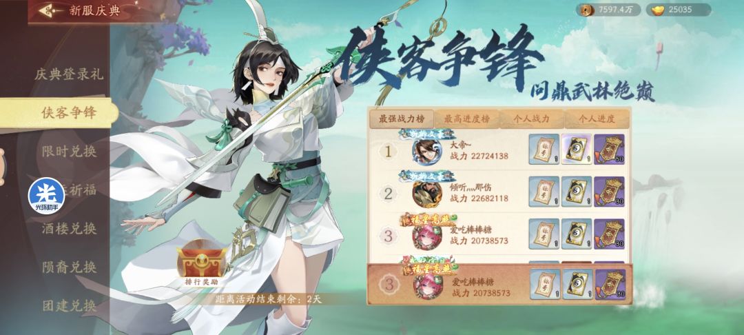 大家新建角色应该都是在新区吧,那开区的活动冲刺少不了,“侠客争锋”奖励丰富,两个冲榜活动(借的别的帖子图哈),战力+推图