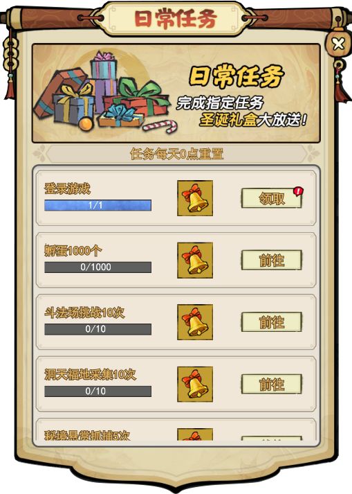 圣诞欢歌为活跃活动,海量宝物等着仙友来获取~