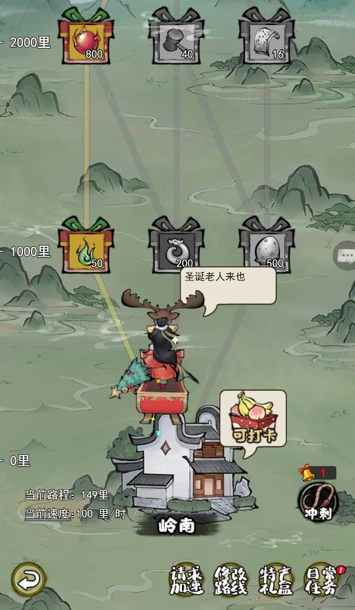 仙友需要规划好从【岭南-江南-关中-天池】的路线(全程共一万里),才能进入该玩法,进入后通过完成孵蛋、斗法场挑战、秘境悬赏抓捕等等日常任务可获取“圣诞铃铛”,消耗“圣诞铃铛”可进行冲刺,冲刺会增加100里路程,并且获得10个星辰,此外,还有机会触发道具奖励、补给礼盒、仙玉大礼包...等等奇遇哦!