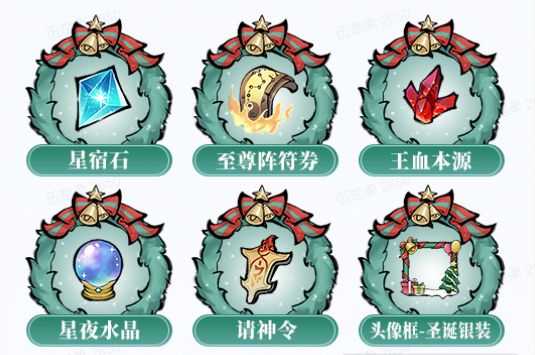 如累充达到一定金额还能领取“星宿石”、“至尊阵符券”、“王血本源”、“星夜水晶”、“请神令”、“头像框-圣诞银装”等等大礼哦~快来获取你想要的道具吧!