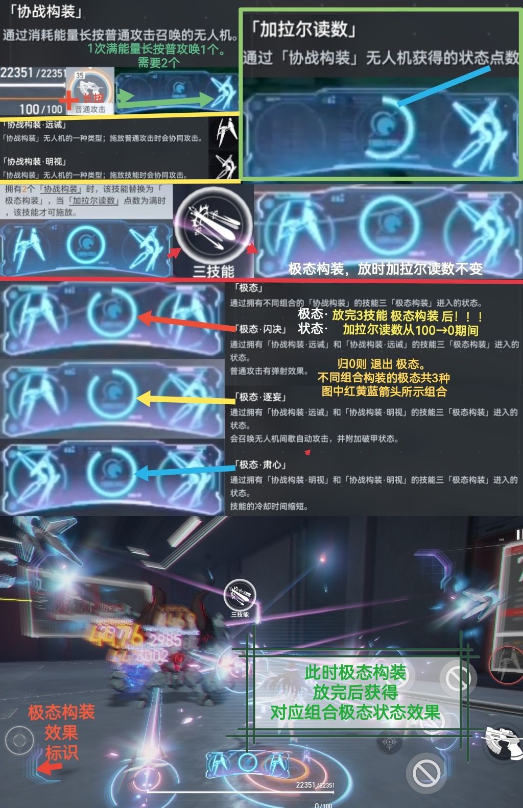 攒满加拉尔读数100(圆环)→根据召唤的2个组合构装,施放3技能极态构装(放技能时霸体免伤90%)→放技能后,进入极态根据组合构装获得对应组合构装效果,持续15s。