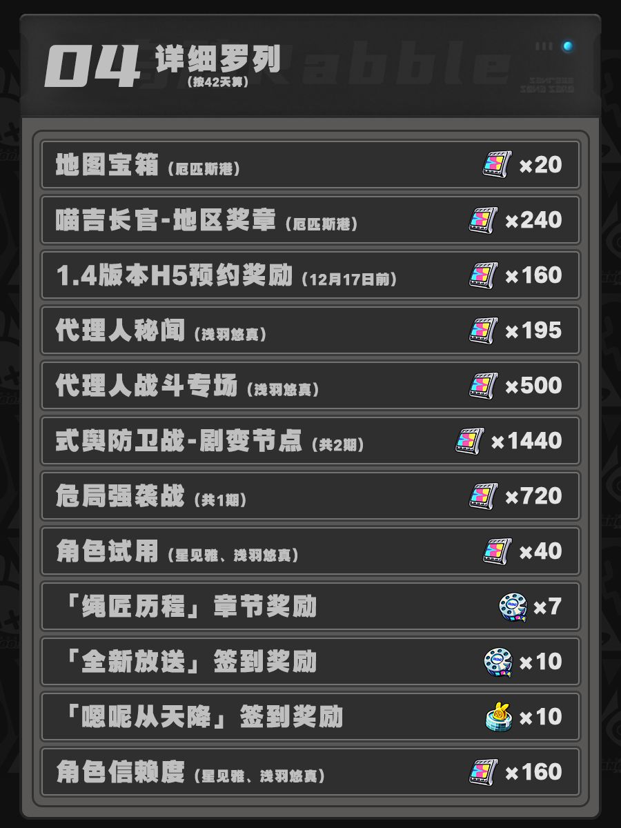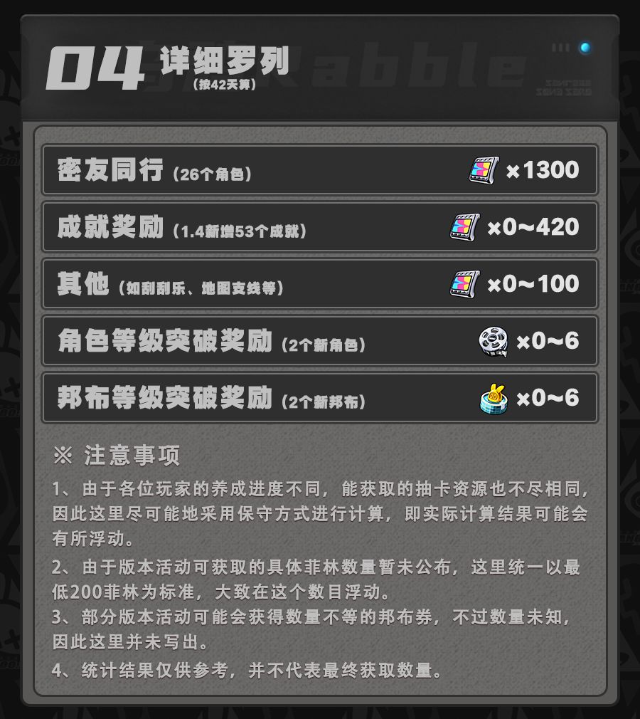 本期给大家带来的是绝区零1.4版本可获取的抽卡资源数量统计,让大家比较直观的看出不同档位下的可获取资源数量,方便自己做好卡池规划。