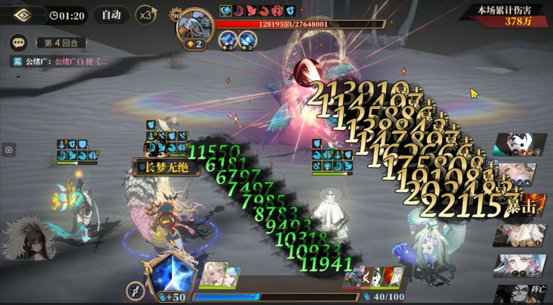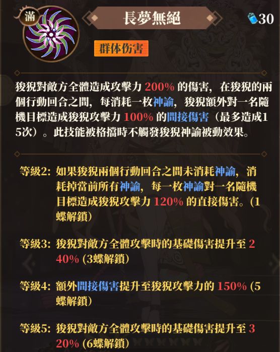 长梦无绝:对全体造成直接伤害,未触发被动‘神谕’时,每一枚‘神谕’额外造成一段直接伤害;触发神谕被动时,每枚‘神谕’被动造成一次间接伤害;