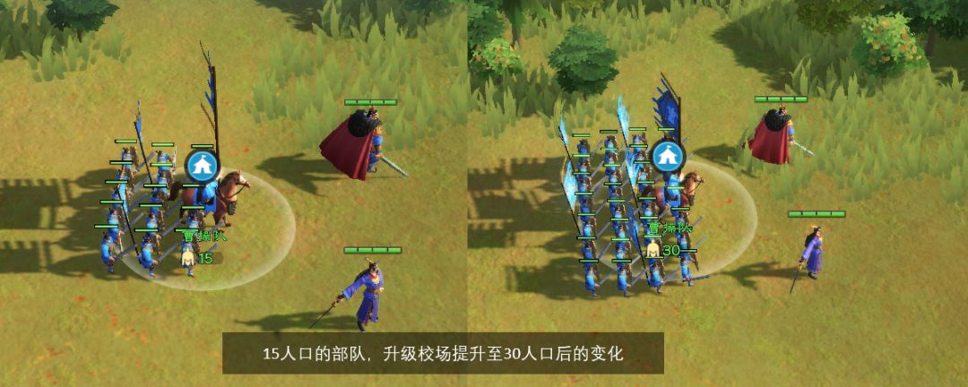 其中人口数值可以通过内城升级校场建筑后提升,每个人口所带的兵力则与武将等级、兵营等级关联。