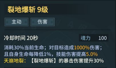 裂地爆斩(满级),核心输出技能,消耗30%的生命和100魂力使用,造成高额伤害,且血量越少,伤害越高。在自身血量满足沸腾之血时候使用,打出贯穿一击可以极大程度扣减BOSS血量。