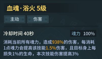 血魂·浴火(满级),主要输出技能之一,消耗全部魂力造成高额伤害,魂力越多,伤害越高。在前期伤害不足的情况下,释放该技能可以较为效率的刷图体验。