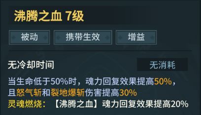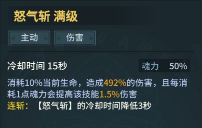 怒气斩(满级),固定消耗10%的生命值和50%的魂力释放,且消耗的魂力越多,伤害越高,通常作用是用来快速触发沸腾之血。