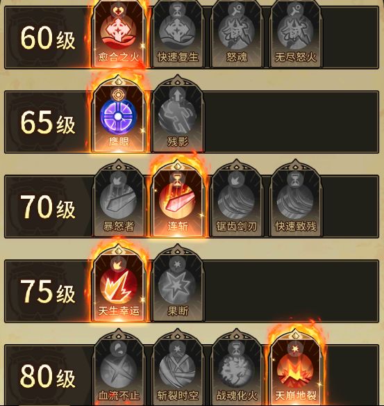 沸腾之血(满级),血量低于百分之五十的时候会提高裂地爆斩和怒气斩的伤害,通常使用裂地爆斩和怒气斩来快速启动。