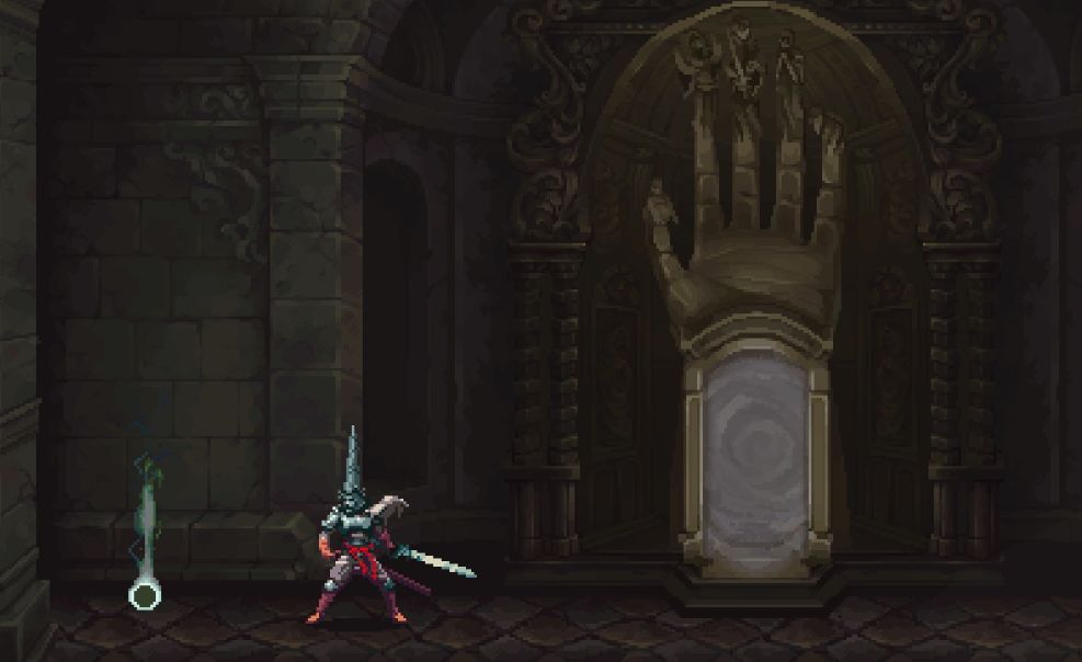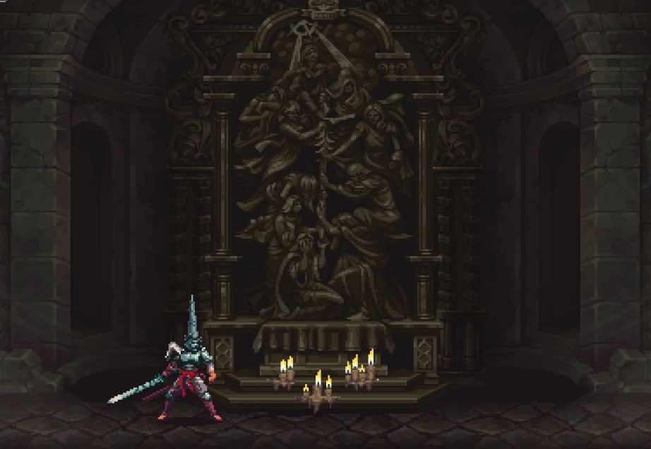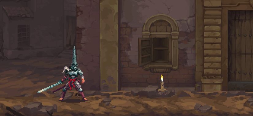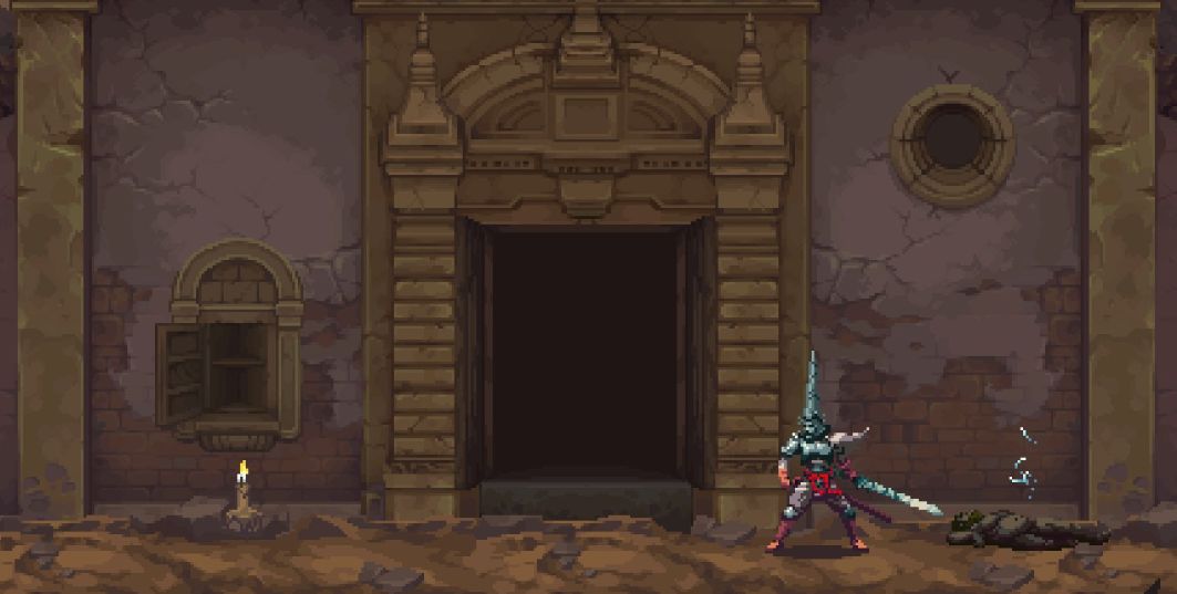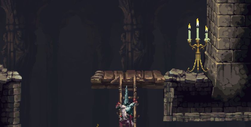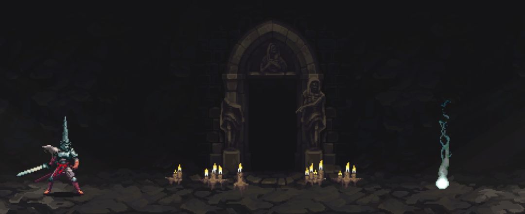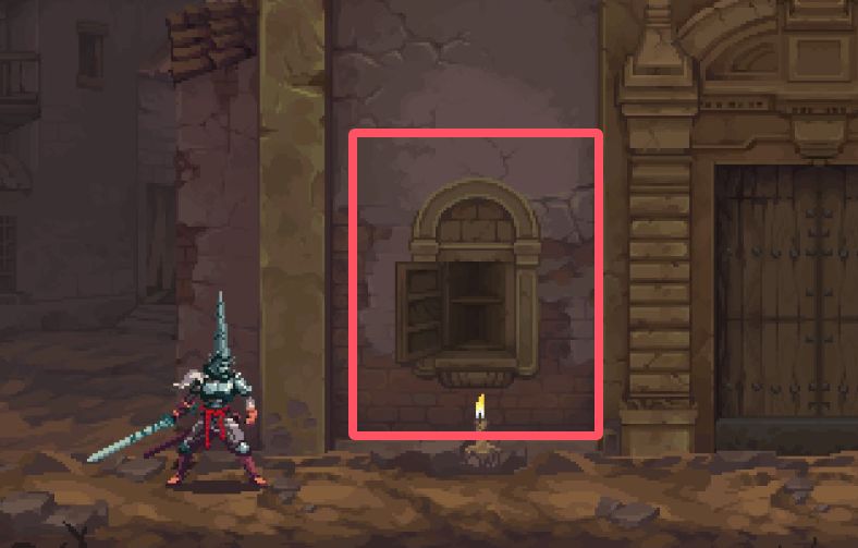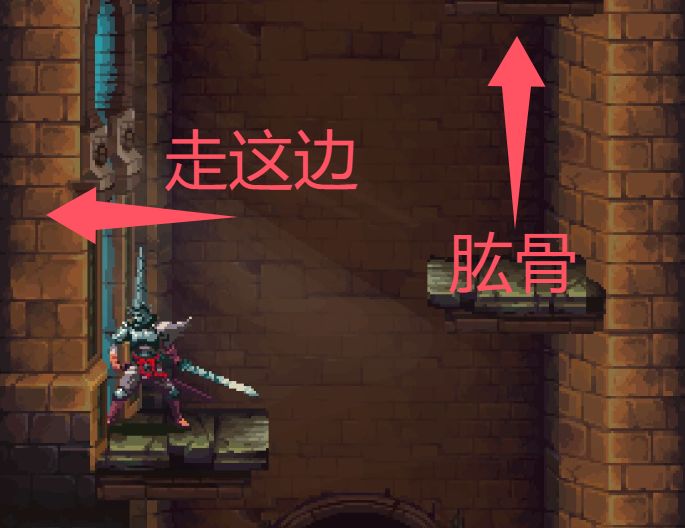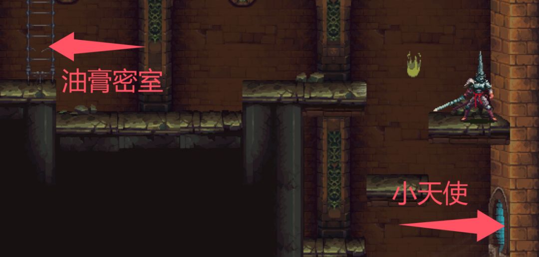 ⑤回到小天使这里,从旁边的门离开,往上走是通往存档点的捷径,正对面是个烛台。站在烛台这里按攻击键可以打破墙面。