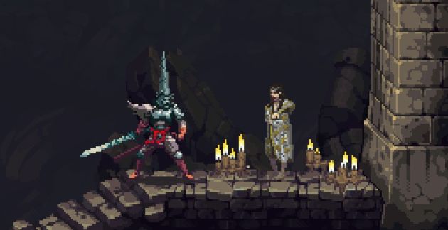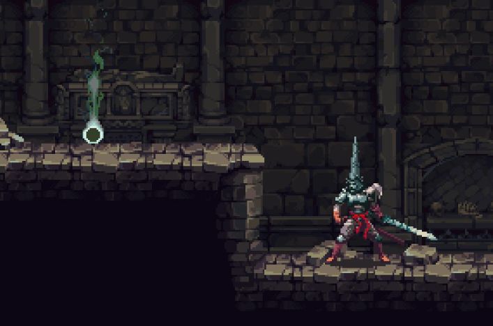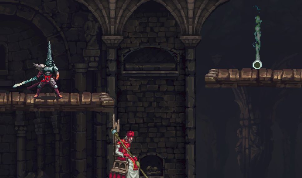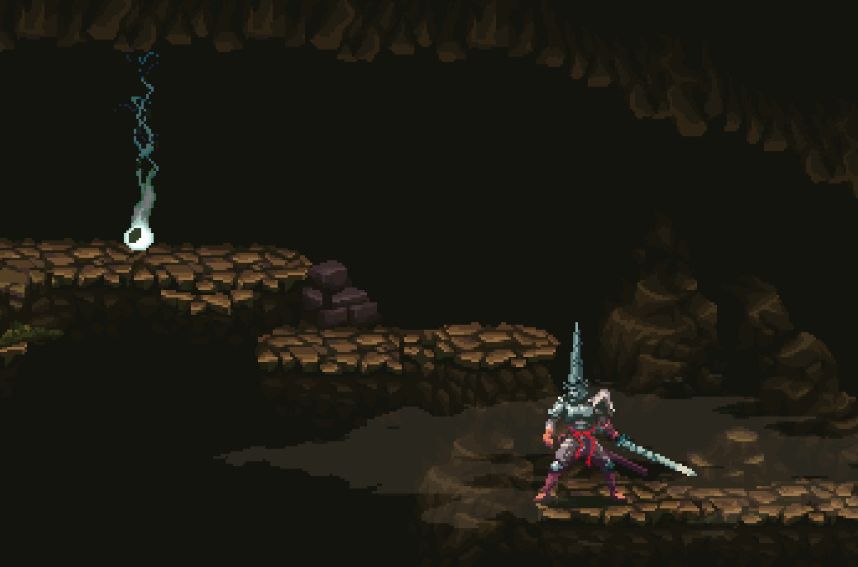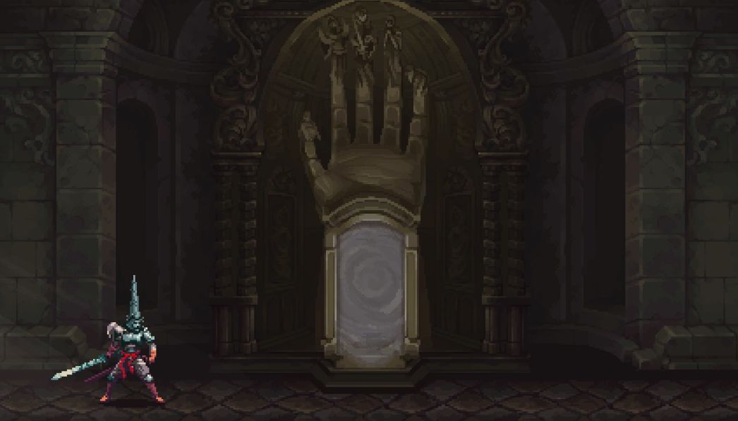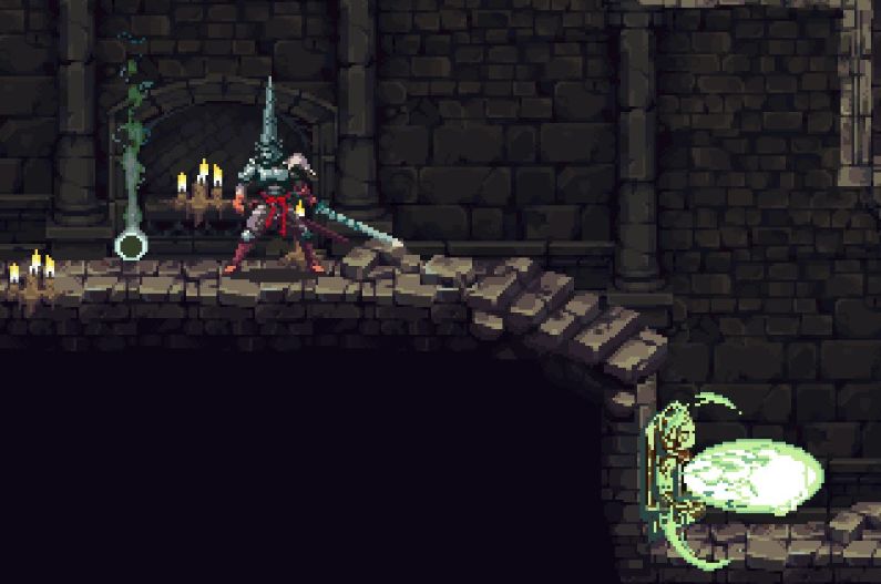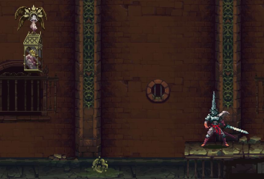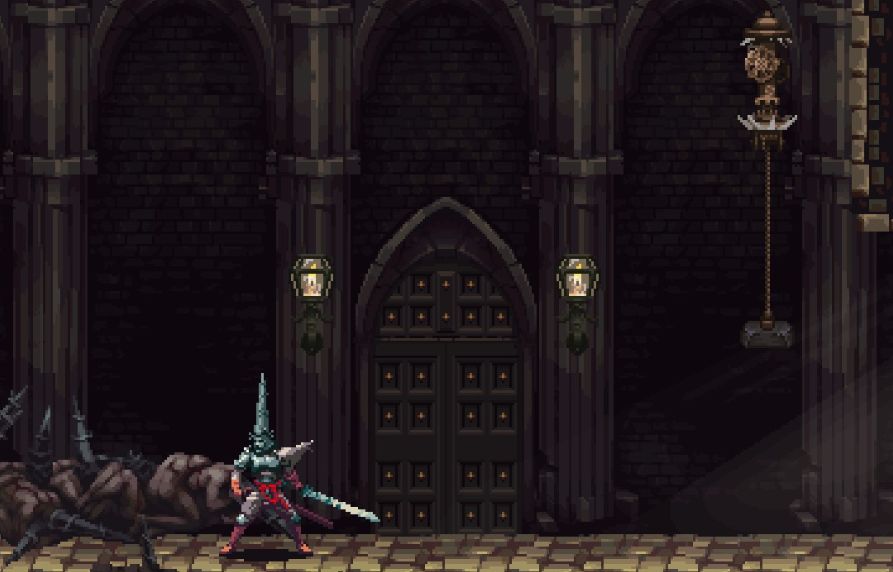 ⑤回到小天使这里,从旁边的门离开,往上走是通往存档点的捷径,正对面是个烛台。站在烛台这里按攻击键可以打破墙面。
