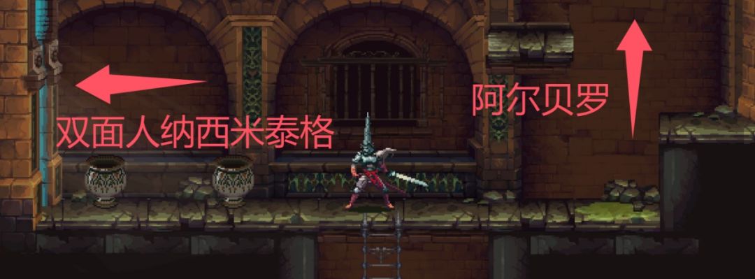 ⑦从哀恸喷泉出来,回到有尸体的地方,沿着来时的梯子向上返回到夹层,走左边靠墙的平台继续向上。