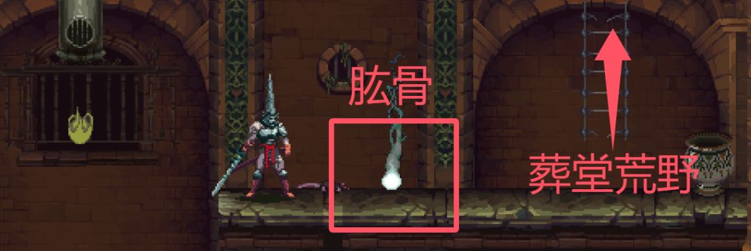 从肱骨旁边的梯子向上就可以返回葬堂荒野,上面没有存档点,现在先不用去。等搜刮完了亵渎之池再从这条路出去。