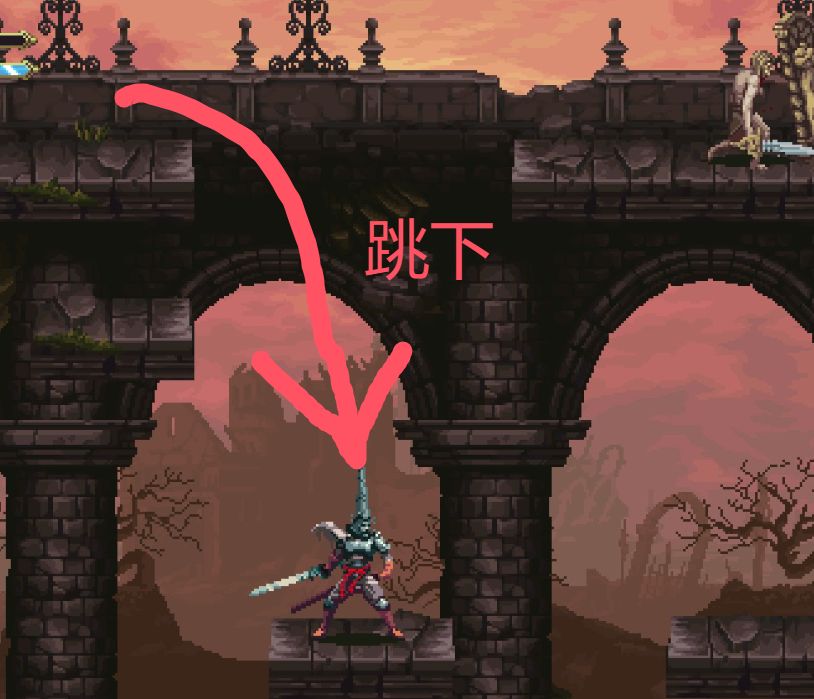 ⑨继续往左走,走到葬堂荒野的第二个建筑(拿痛德之心的那栋),有个向下的梯子,下到底层右手边有个出口。出去后很快遇到路面深坑,这里可以跳下去。