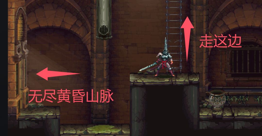 继续向左走,到金色的门前面,进门是无尽黄昏山脉,先不进去,沿着门旁边的梯子往上走。