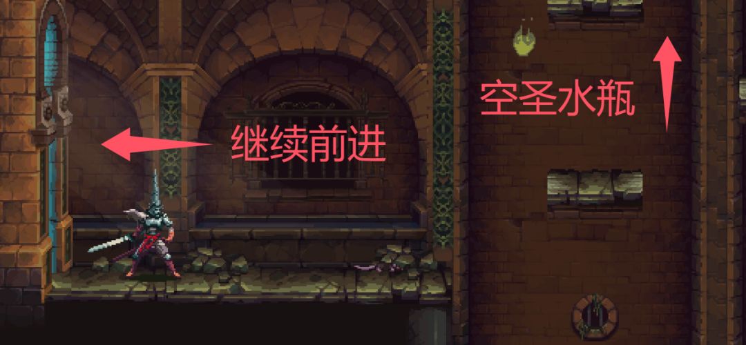 房间的尽头是空圣水瓶,拿圣水瓶的途中会被小怪埋伏。可以先去不远的存档点保存一下再回来取。