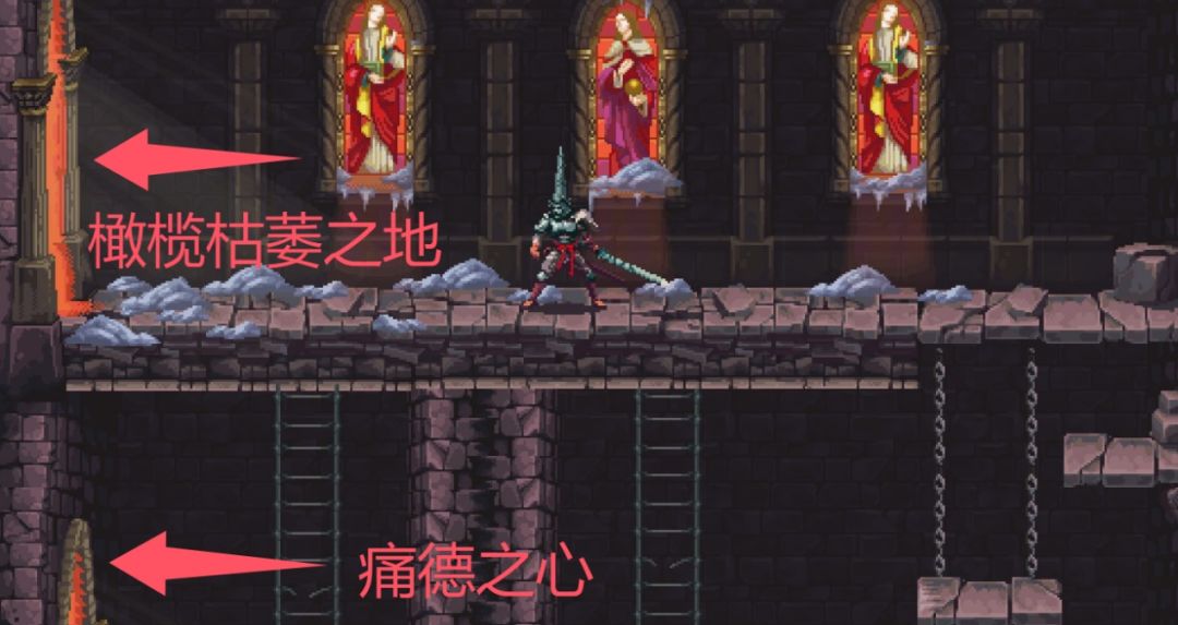 然后从肱骨上方的捷径出去,抵达葬堂荒野,一路走到痛德之心那个建筑,爬到痛德之心上面一层,从有雪的门进入橄榄枯萎之地。