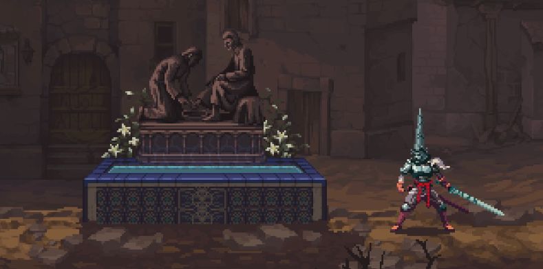 从痛德之心这个建筑最下层的门出去,往前走一段就到了慈悲梦境。先往下走,楼梯经过的第一扇门(右手边)是忏悔祭坛,可以进去花钱把没捡的尸体捡了。然后继续往下走,有两扇门的地方,左手边是存档点,先进去存个档再继续探索。