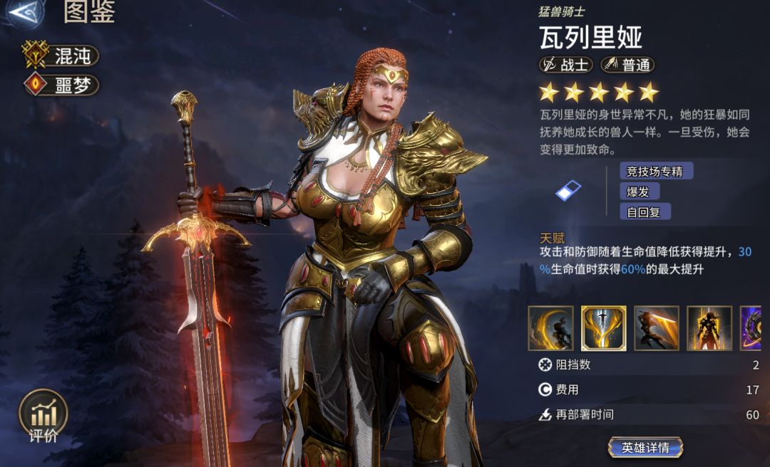 混沌领主(基于生命值提供加成、低血增伤):混沌领主格汉可基于成员已损失生命值提升伤害,与瓦列里娅自带的60%增伤叠加,拥有更高上限的爆发;此外在低血量时还能在提升20%攻击、防御,,搭配混沌领主使用可将爆发最大化。